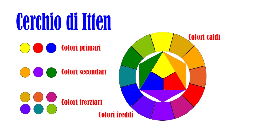 In aiuto a costruire una palette colori arriva il Cerchio di Itten, ideato dal pittore Johannes Itten. Questo strumento è formato da un triangolo con i colori primari, giallo, rosso e blu, racchiuso da un esagono con i colori secondari, il viola (rosso e blu), l’arancione (giallo e rosso) e il verde (giallo e blu). All’esterno troviamo i colori terziari che nascono dalla combinazione del colore secondari e un colore primario.